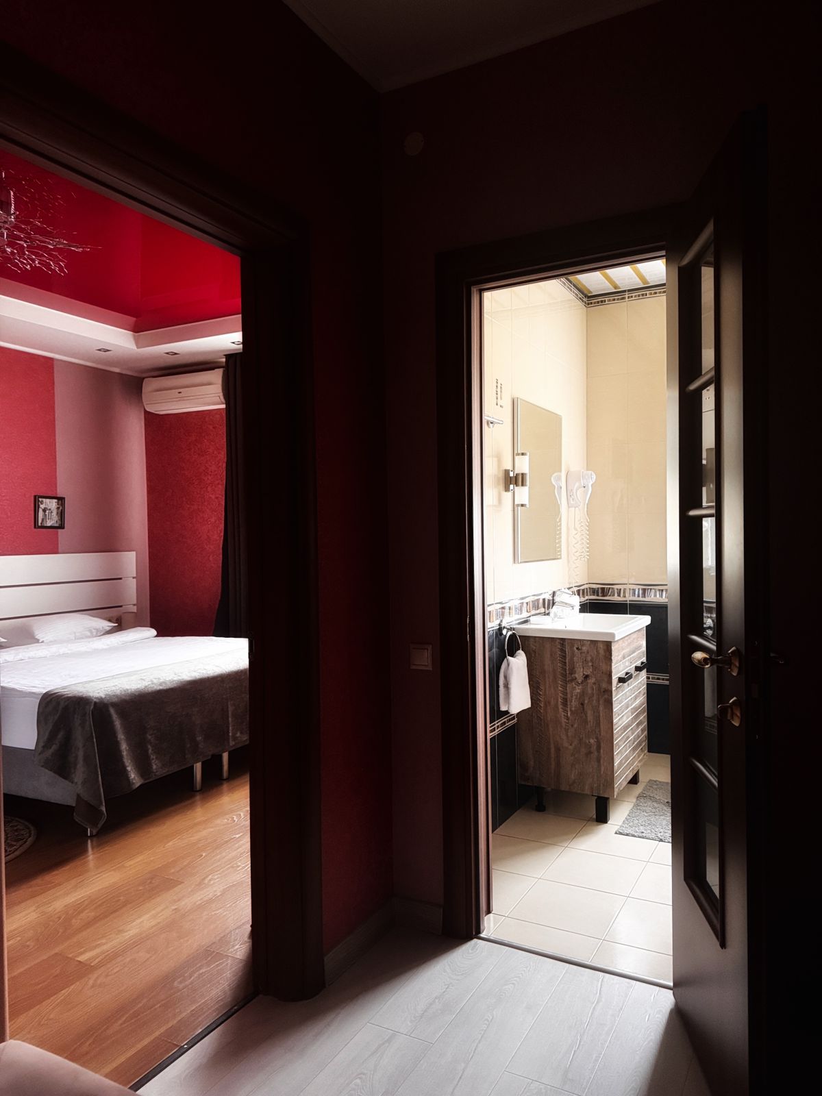 Услуги в номере: плазменная панель с выходом в интернет, холодильник, электрочайник, телефон, система кондиционирования, фен, встроенный шкаф-купе, гипоаллергенное постельное белье.