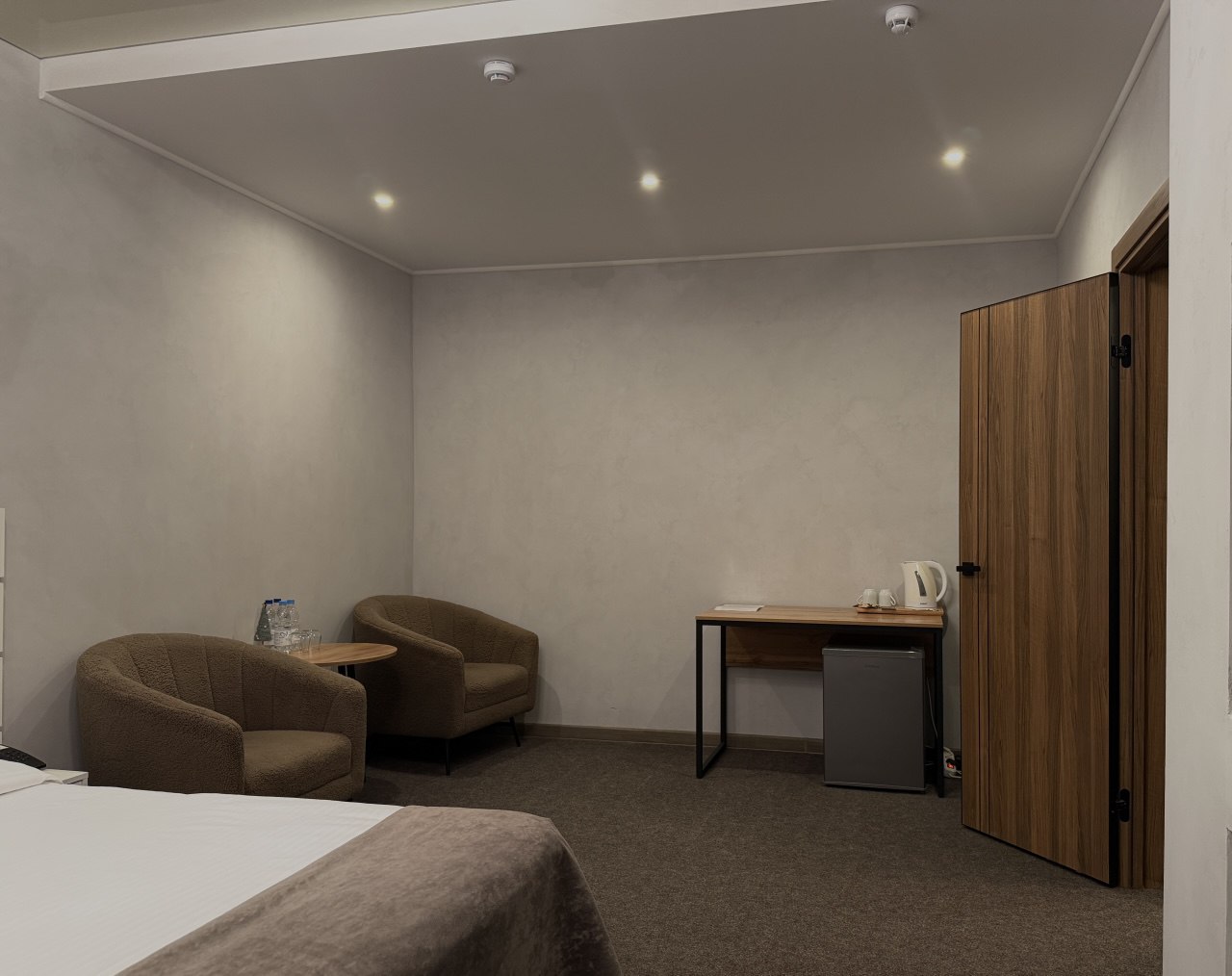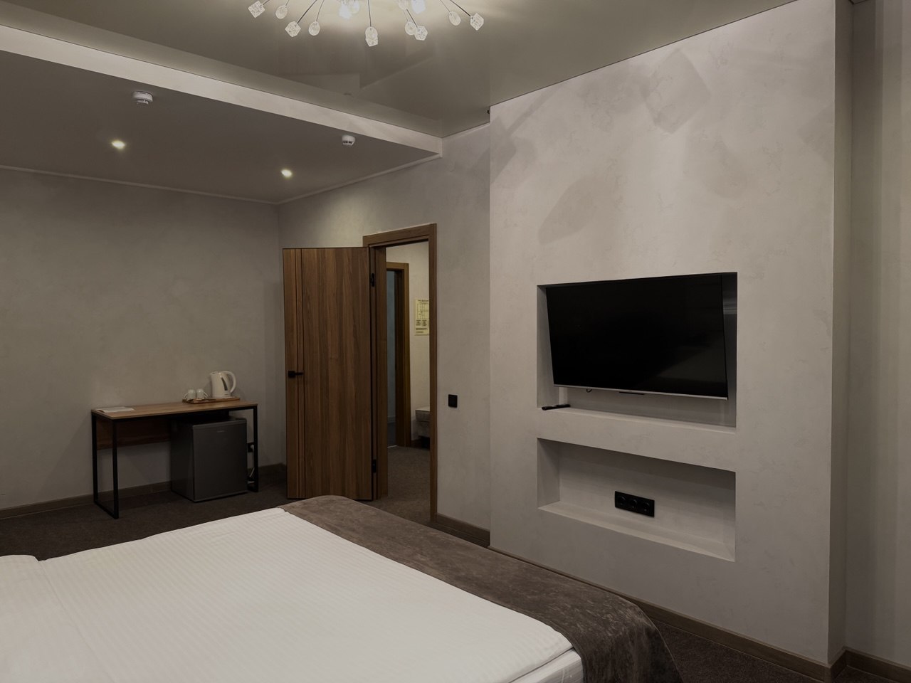Услуги в номере: плазменная панель с выходом в интернет, холодильник, электрочайник, телефон, система кондиционирования, фен, шкаф, гипоаллергенное постельное белье.