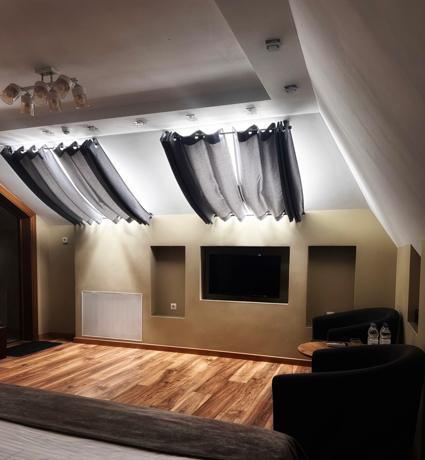 Просторный, уютный, мансардный номер позволит гостям комфортно отдохнуть и приятно провести время вдали от городской суеты. Номер отделан в современном стиле, имеются двухспальная кровать и современная техника. Вид из номера на звездное небо.
