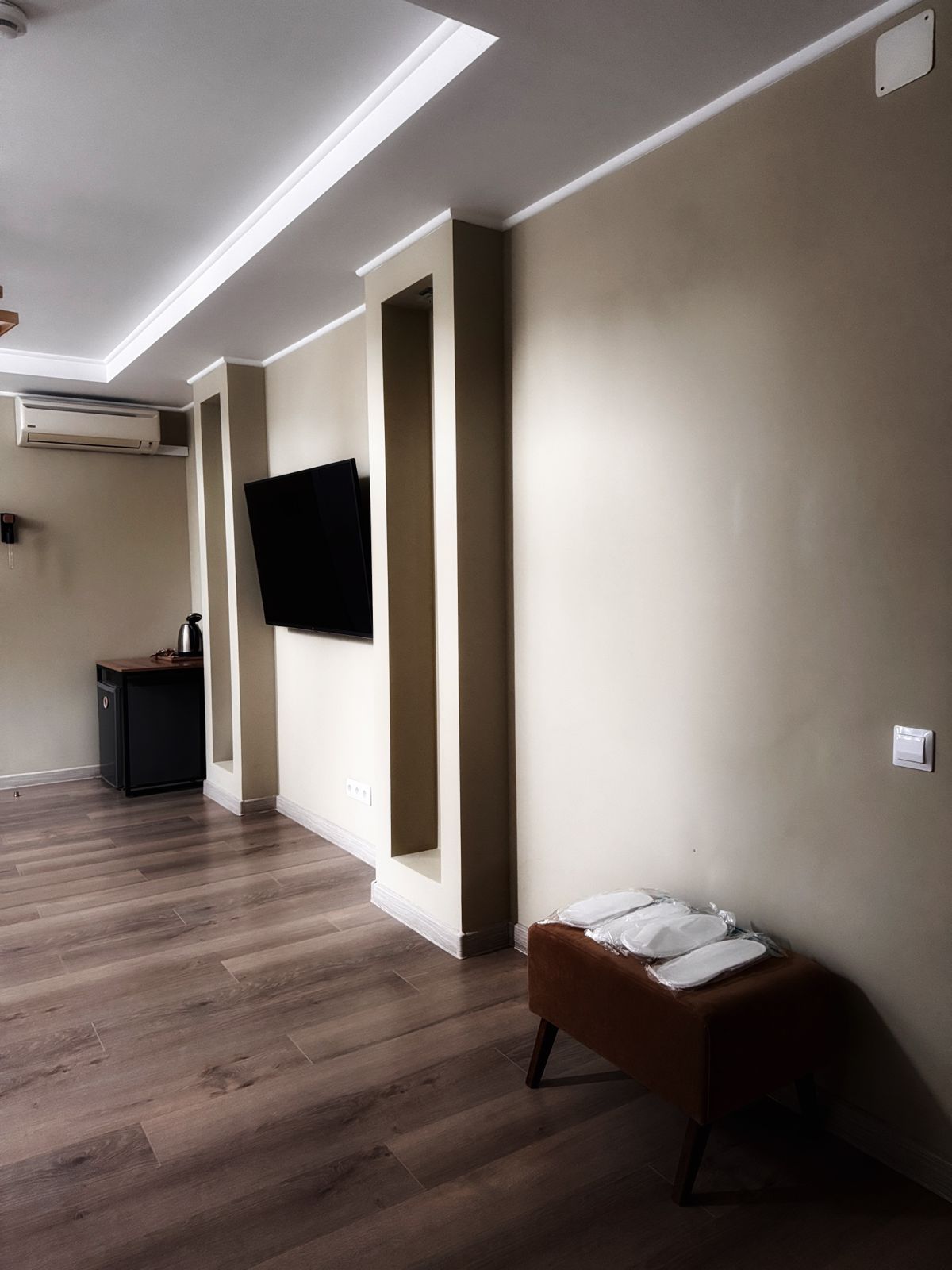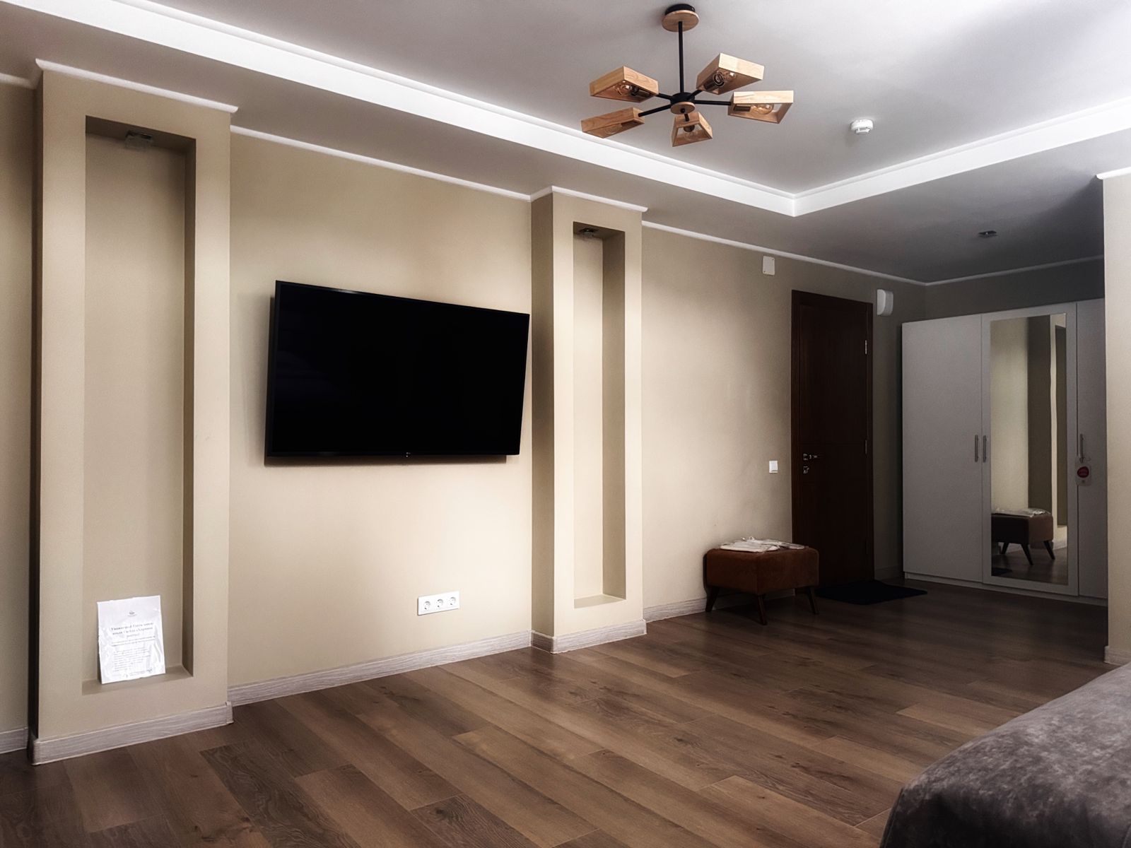 Услуги в номере: плазменная панель с выходом в интернет, холодильник, электрочайник, система кондиционирования, фен, шкаф, гипоаллергенное постельное белье.